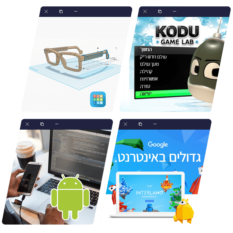 בינה מלאכותית, בניית משחקי מחשב, גרפיקה, עיבודי מדיה, מידענות, תהליך החקר, עריכת וידאו, שימוש בתוכנות עריכת מדיה, אנימציית קו, הגנה על הפרטיות באינטרנט, יסודות התלת מימד, עיצוב סרט, עריכת סאונד, שילוב אלמנטים, אנימציית אביזרים ואנושית, אנימציה דו מימדית, תיעוד ממוחשב לשיפור תהליכי רפליקציה, אנימציה תלת מימדית, יישומונים מתמטיים, אבטחת המחשב, שיתוף פעולה בקבוצות, כלים לשיפור חשיבה מופשטת, כלים לניתוח בעיות ופתרונן ועוד.